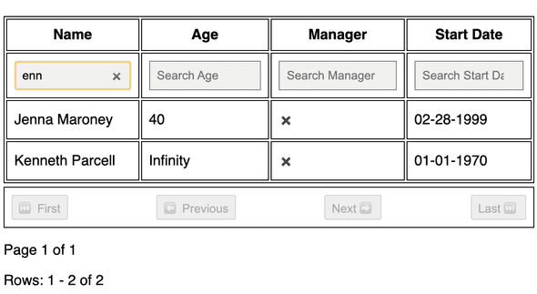 Now another row can be added in the headers with a search bar. In a design, this might be populated by clicking on a filter icon, or it can just be displayed in the row as in this example. Although I'm just doing a search bar that requires manual typing for simplicity here, you would probably want to handle each datatype differently - for example, a Boolean could be handled by a dropdown with options for true, false, and clear. You might also have a dataset that includes an enum where the values are known, like role where the options are Writer, Manager, Producer. That could be a dropdown as well instead of making the user type in the values. You could also require only numbers in the number field, and use a date picker for the date field.
